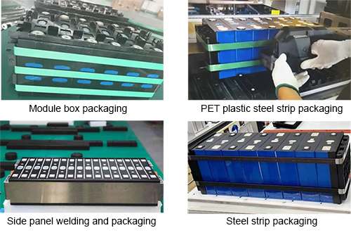 Em seguida, o trabalhador aplica a cinta de aço ou fita de amarração no módulo para evitar deslocamento ou deformação durante o transporte e a montagem subsequentes. Isso também pode otimizar a resistência de contato entre as células da bateria e melhorar o desempenho elétrico e a eficiência de carga e descarga do módulo.