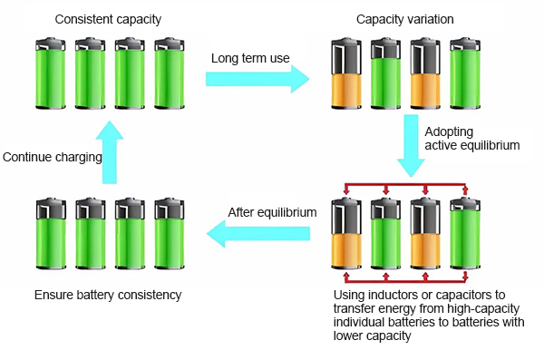 O balanceamento ativo transfere as células com maior energia no conjunto de baterias para as células com menor energia por meio de transferência de energia para atingir o equilíbrio energético entre as células.