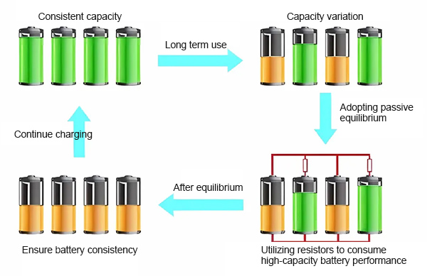 A energia das células com maior energia no conjunto de baterias é consumida por meio de descarga de resistência simples ou transferência de calor para atingir o equilíbrio energético entre as células.