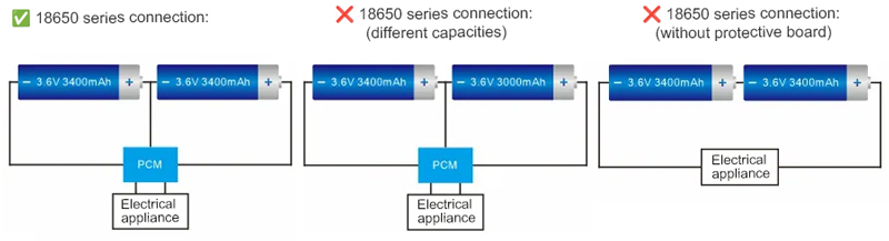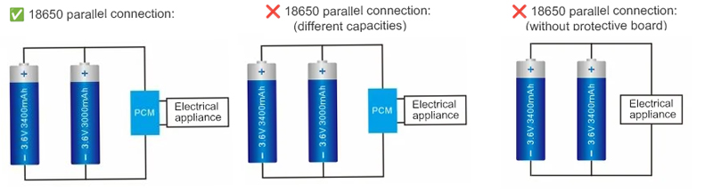 Por razões de segurança, as baterias de lítio devem ser conectadas a uma placa de proteção externa para monitorar cada célula. A operação em paralelo geralmente não é recomendada. Caso seja necessário o uso em paralelo, os parâmetros das baterias (capacidade, resistência interna, etc.) devem ser consistentes. Além disso, os parâmetros das baterias utilizadas em série também devem ser consistentes. Caso contrário, o desempenho do conjunto de baterias será significativamente inferior ao de uma única célula.