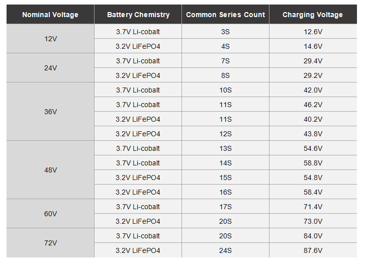 Por exemplo, 7,4V, 12V, 24V, 36V, 48V, 60V, 72V, etc.