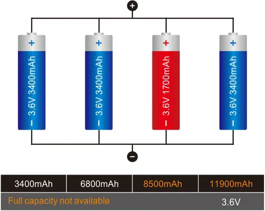 Misturar baterias de lítio de diferentes capacidades ou baterias novas com usadas pode causar vazamento e tensão zero. Isso ocorre porque as diferenças de capacidade durante o processo de carregamento fazem com que algumas baterias sejam sobrecarregadas enquanto outras são subcarregadas. Durante a descarga, baterias de alta capacidade podem não ser totalmente descarregadas, enquanto baterias de baixa capacidade podem ser descarregadas em excesso. Esse ciclo vicioso danifica as baterias, causando vazamento ou baixa (ou nenhuma) tensão.