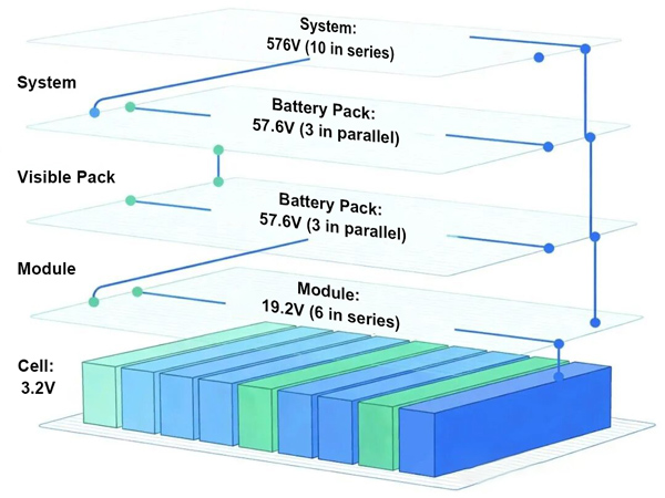 A voltagem é determinada por hierarquia: progredindo da célula individual (3,2V) para o módulo (25,6V), o conjunto de baterias (~400V) e, finalmente, o sistema (720V), os níveis de voltagem se acumulam à medida que o nível hierárquico aumenta.